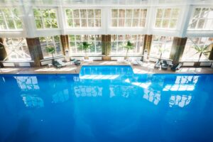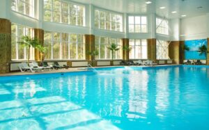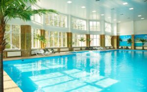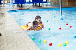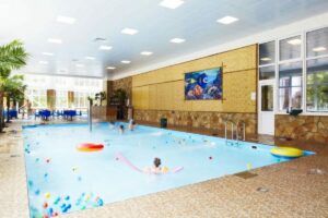 Детский бассейн имеет глубину от 0,75 до 1,10 м, температура воды 30 °C