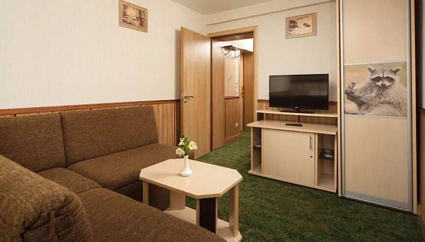 Проживание домашних животных допускается в номерах Стандарт, Стандарт плюс, Супериор, Семейный — собак до 10 кг, при наличии ветеринарных документов установленного образца.