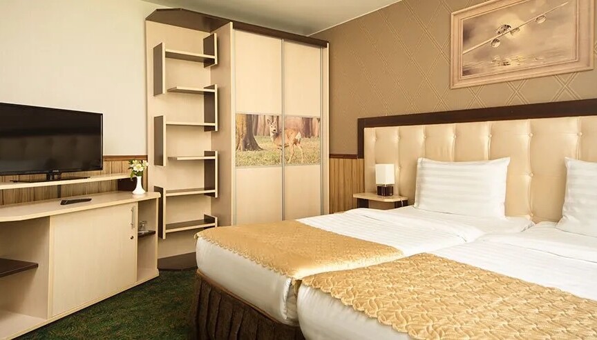 В каждом номере есть балкон. Из окон открывается вид на лес, ресторан, спа-салон и площадь с фонтаном. В номерах данной категории не предусмотрено дополнительное пространство в номере: две раздельные кровати, две прикроватные тумбочки, две прикроватные лампы, шкаф для одежды и гардеробная.